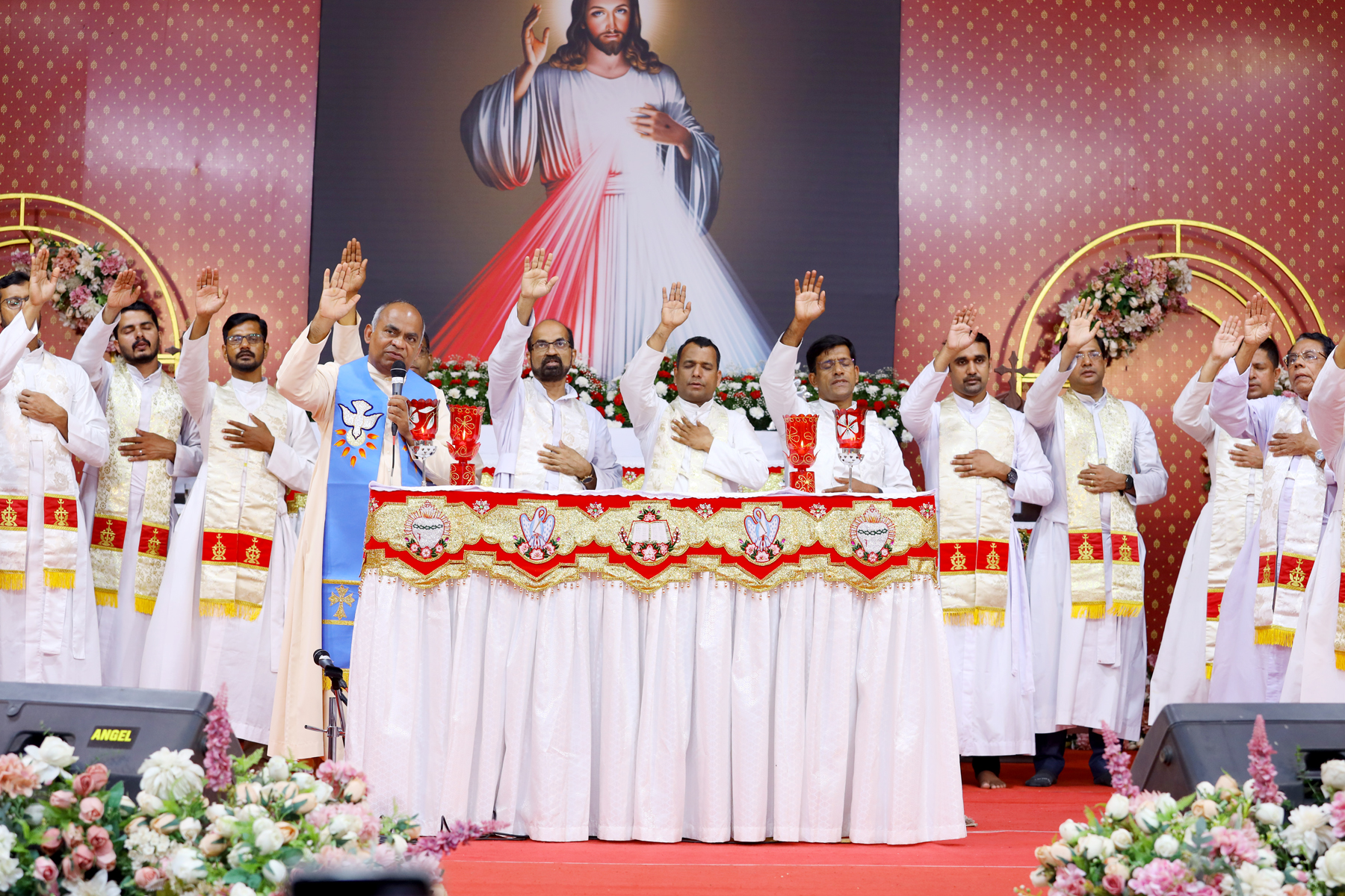 അഭിഷേകാഗ്നി ബൈബിൾ കൺവൻഷൻറെ സമാപനത്തിൽ ബഹു. സേവ്യർ ഖാൻ വട്ടായിലച്ചനും മാന്നാനം ആശ്രമത്തിലെ ബഹു. വൈദികരും ജനങ്ങളെ ആശിർവദിക്കുന്നു.