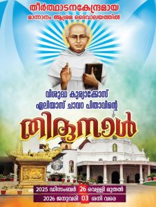 വിശുദ്ധ കുര്യാക്കോസ് ഏലിയാസ് ചാവറപിതാവിന്റെ തിരുനാള് മാന്നാനം സെന്റ് ജോസഫ്സ് ആശ്രമദൈവാലയത്തില് 2025 ഡിസംബര് 26 വെള്ളി2025 ഡിസംബര് 26 വെള്ളി മുതല് 2026 ജനുവരി 3 ശനി വരെമുതല് 2026 ജനുവരി 3 ശനി വരെ ഭക്തിനിര്ഭരമായ, അനുഗ്രഹദായകമായ തിരുക്കര്മ്മങ്ങളോടെ ആഘോഷിക്കുന്നു.